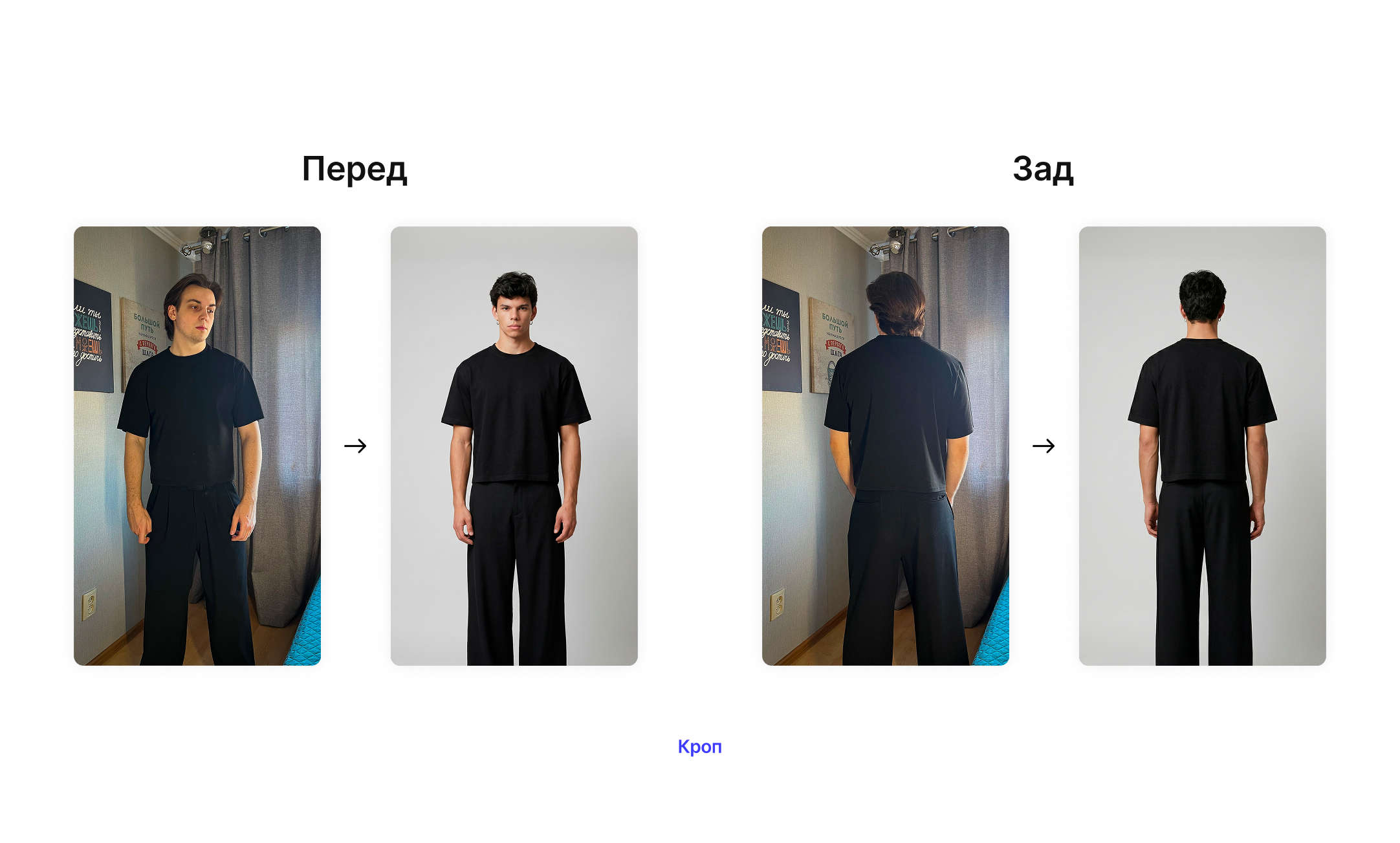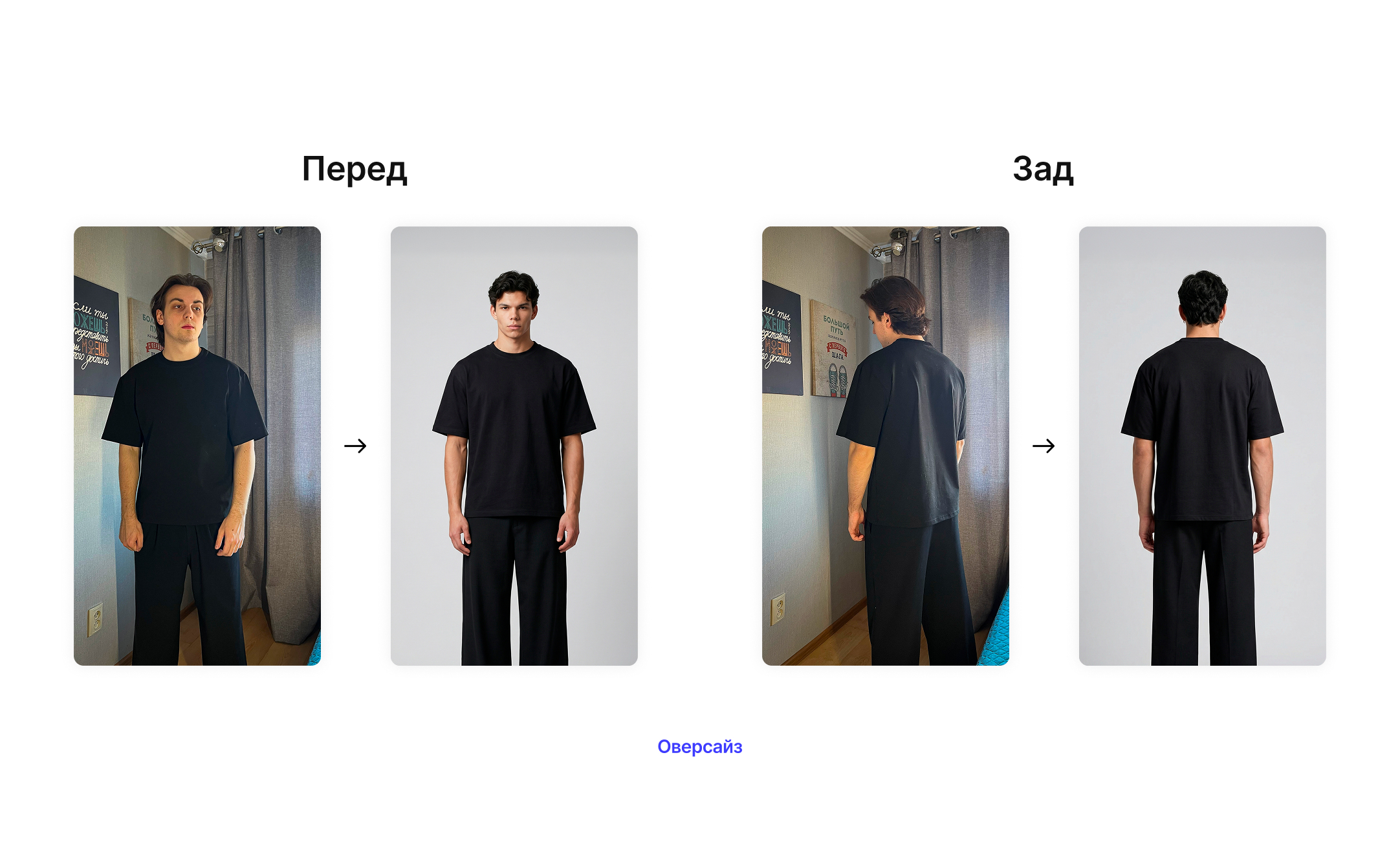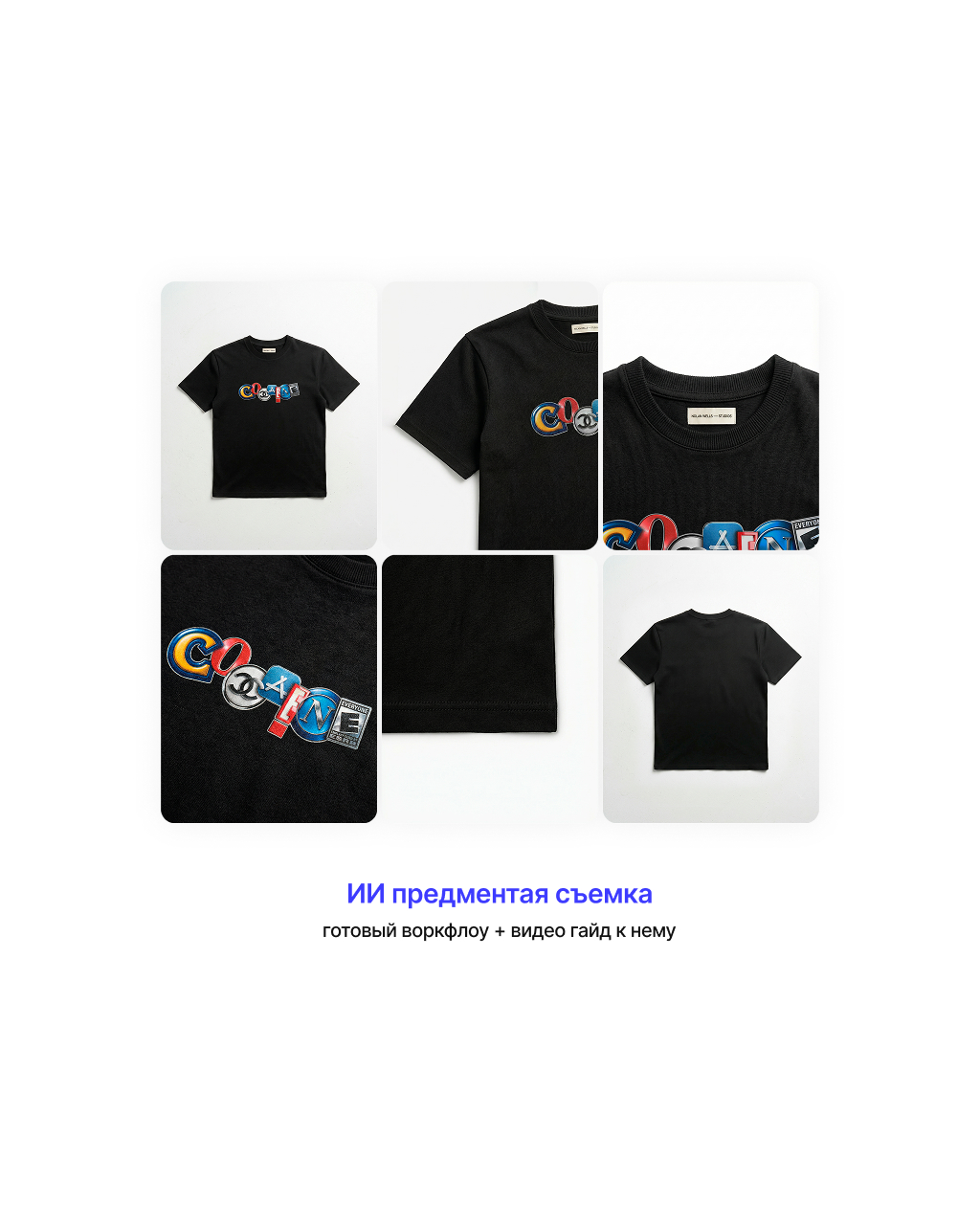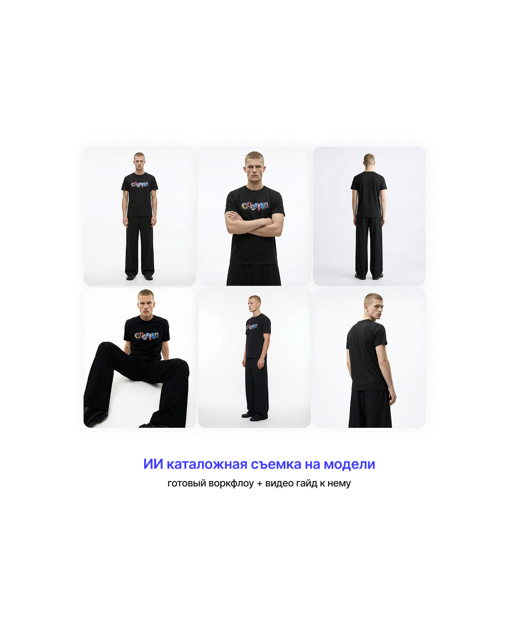 Главная инновация набора. Вы получаете готовый алгоритм и подробный видеогайд по работе с нейросетями. С их помощью можно генерировать идеальную посадку на моделях и детальные макро-снимки (с фактурой принта и бирками) прямо из мокапа. Нейросеть с фотореалистичной точностью передает особенности каждого из трех кроев (один к одному с реальной жизнью).