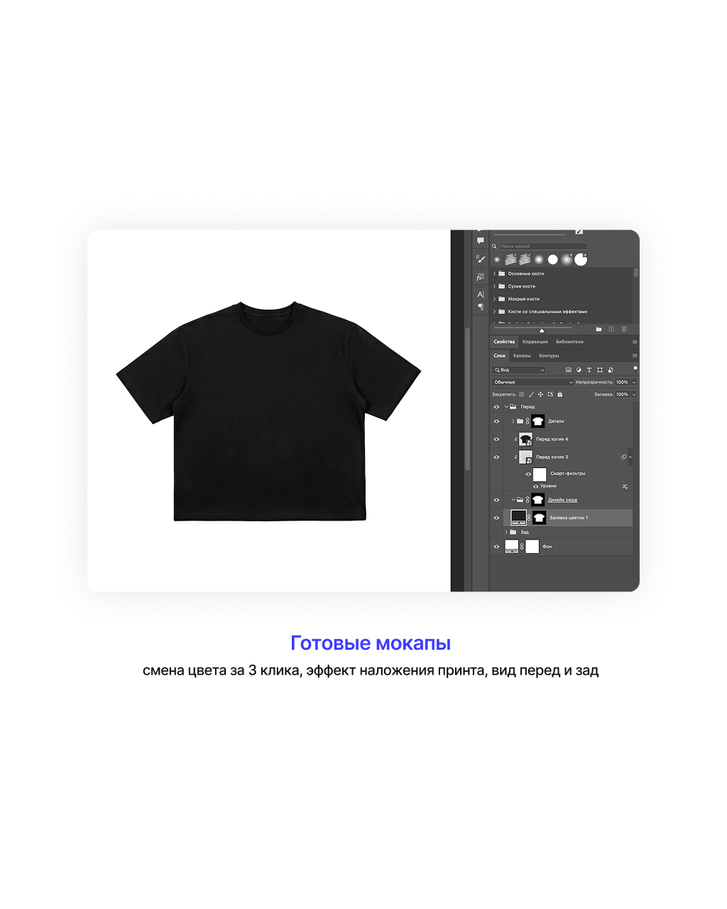 В набор входят фотореалистичные исходники футболок (вид спереди и сзади). Смена цвета изделия происходит всего в 3 клика, а любой добавленный дизайн или патч получает эффект естественного наложения, перенимая текстуру ткани.
